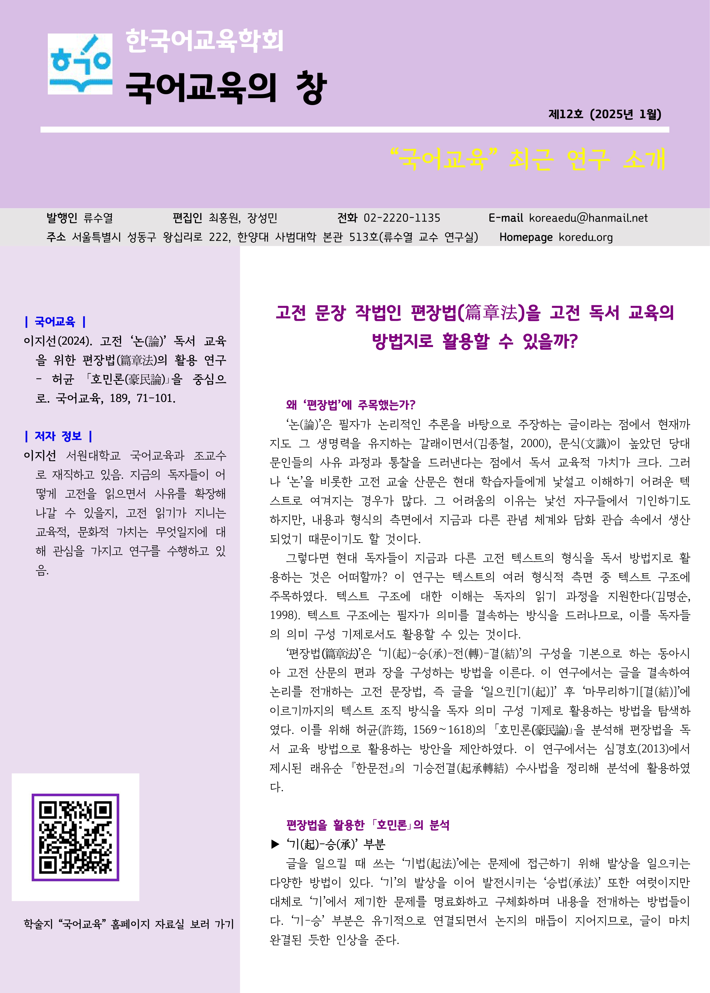 제12호로 서원대학교 국어교육과 이지선 교수님의 '고전 문장 작법인 편장법(篇章法)을 고전 독서 교육의 방법지로 활용할 수 있을까?'를 전해드립니다.