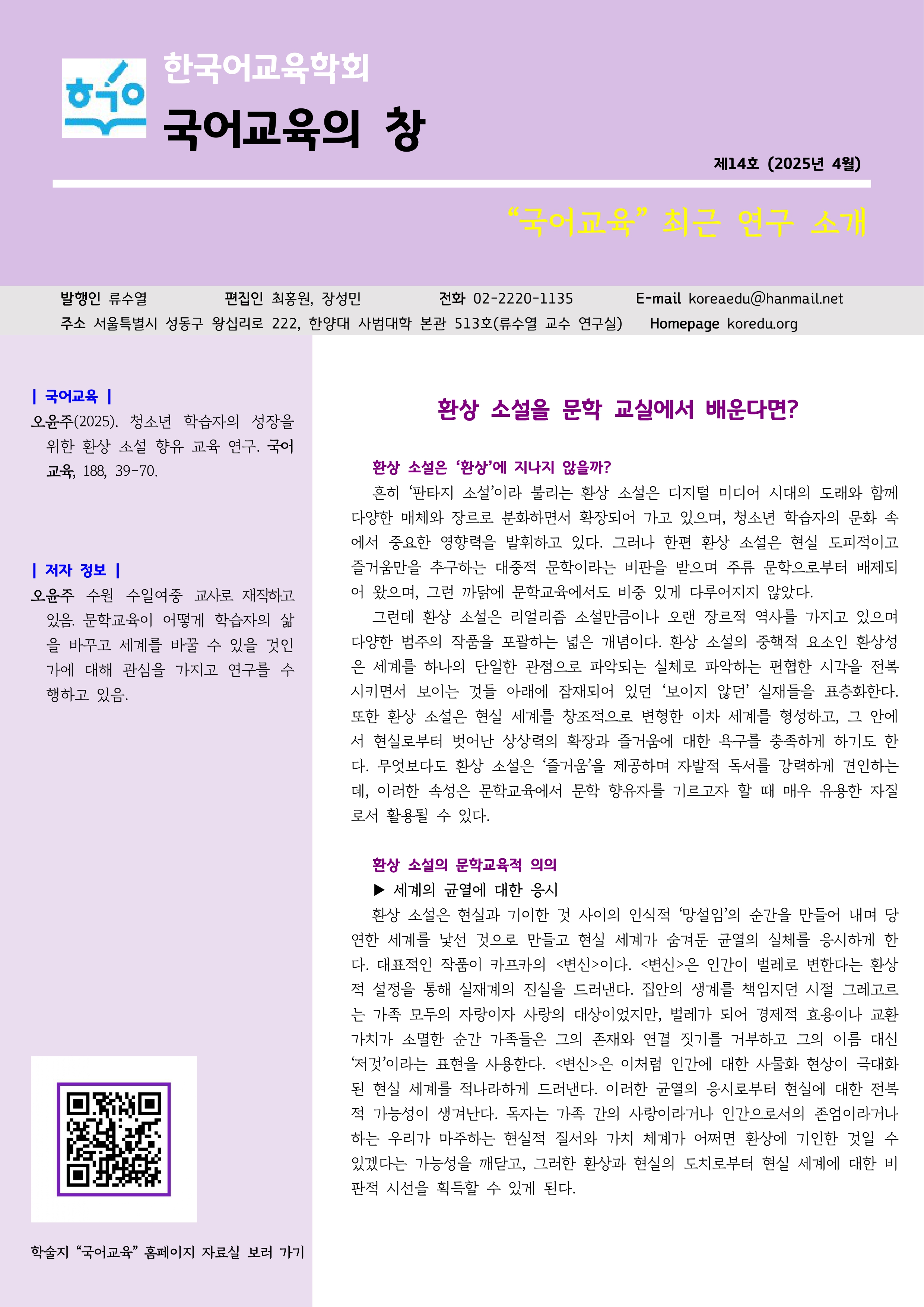 안녕하십니까? 한국어교육학회입니다. <국어교육의 창> 제14호가 발간되어 새로이 소식을 전해드립니다. 제14호로 수일여자중학교 오윤주 선생님의 '환상 소설을 문학 교실에서 배운다면?'을 전해드립니다. 앞으로도 많은 관심과 성원을 부탁드립니다.