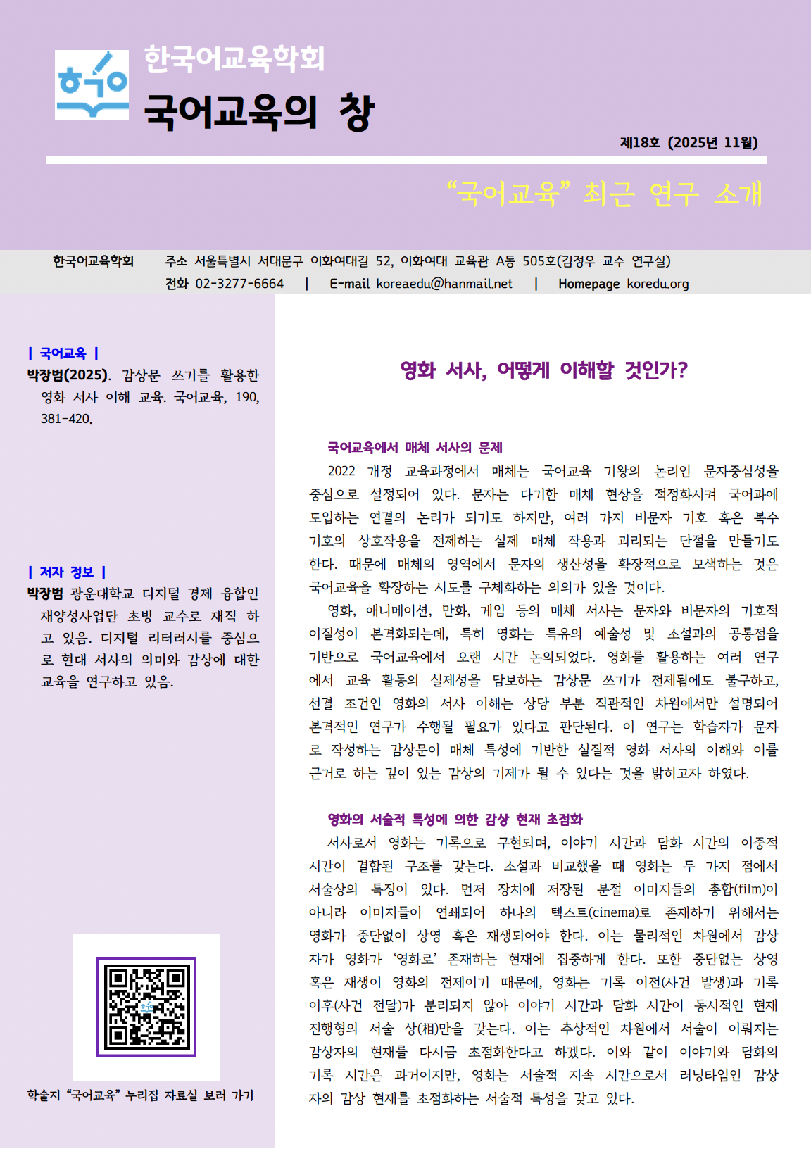 <국어교육의 창> 제18호가 발간되어 새로이 소식을 전해드립니다. 제18호로 박장범(광운대) 선생님의 '영화 서사, 어떻게 이해할 것인가?'를 전해드립니다.