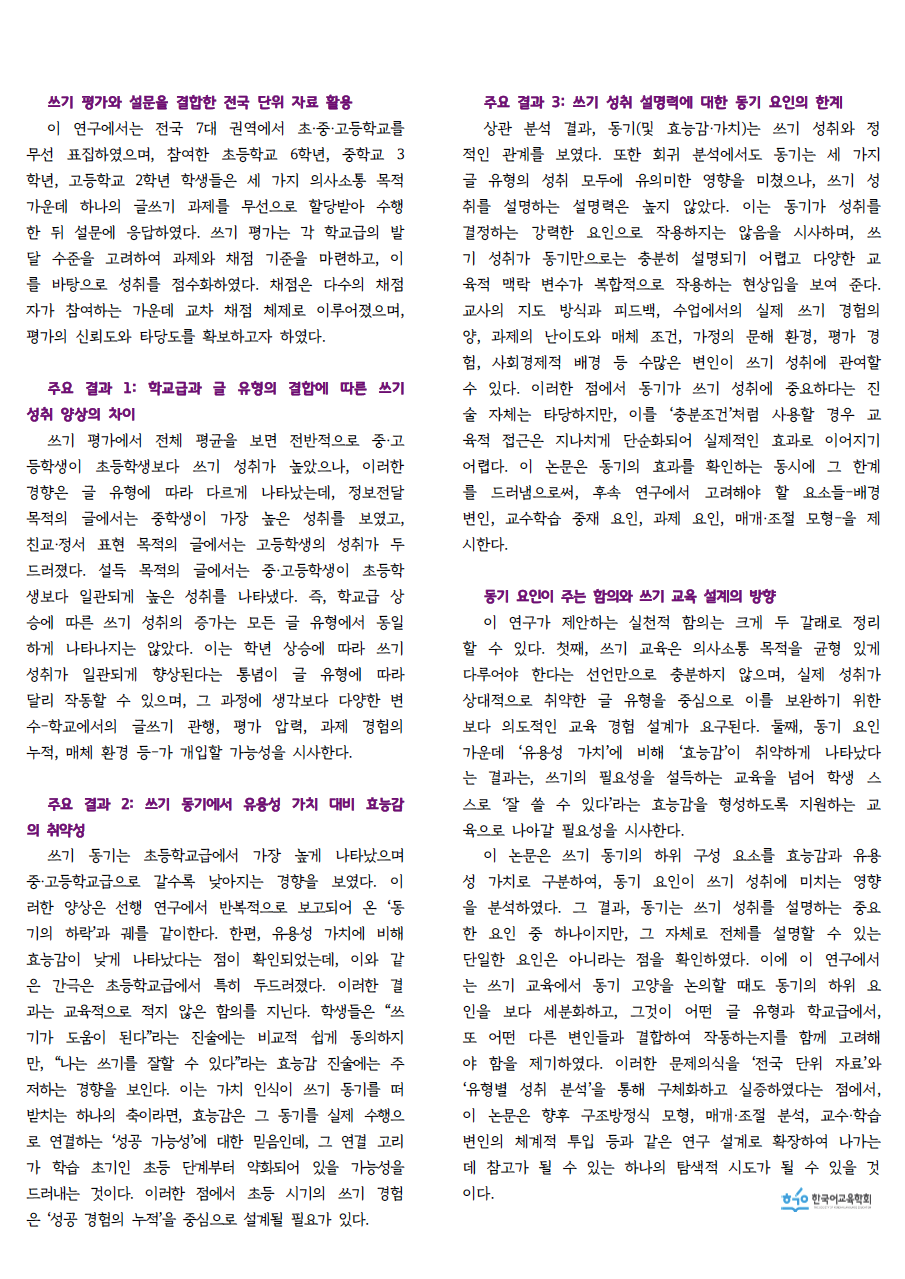 제20호로 박혜영(평가원), 이명진(평가원) 선생님의 '쓰기 동기는 쓰기 성취를 끌어올리는가? 초·중·고 자료로 본 ‘쓰기 동기와 쓰기 성취의 관계’'를 전해드립니다.
